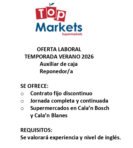 Supermercados en Cala’n Bosch y Cala’n Blanes (Menorca), precisan incorporar AUXILIAR DE CAJA – REPONEDOR/A.