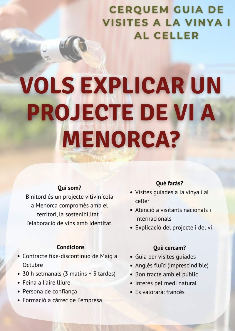 Binitord es un proyecto vitivinícola en Menorca comprometido con la tierra, la sostenibilidad y la elaboración de vinos con identidad. Precisamos incorporar un/a GUÍA DE ENOTURISMO en Ciutadella